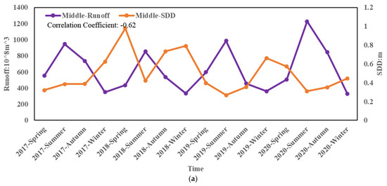Figure 10 presents the relationships between the three driving factors of sediment runoff, water level, and precipitation in the upper reaches of the Yangtze River. There are negative correlations between the SDD and runoff, SDD and water level, and SDD and PRCP, which have correlation coefficients of −0.79, −0.62 and −0.75, respectively. During 2017–2020, the upper reaches of the Yangtze River have the lowest in summer; higher in spring, autumn, and winter than in summer, and the highest in winter, but slightly higher in spring than in winter 2020. The main reason for the rainfall being the lowest in summer is that the rainy season is from May to September every year, and the flood season of the Yangtze River is from July to August or September every year. Although the precipitation along the Yangtze River increases in summer, the temperature of the Qinghai Tibet Plateau in the upper reaches of the Yangtze River Basin is increasing significantly under the background of global warming due to atmospheric greenhouse effect caused by human activities. The head temperature shows an increasing trend, and the melting rate of ice and snow is accelerating [50]. The increase in surface runoff introduces a large volume of sediment, which may increase water turbidity and cause the water quality to decrease in summer. The amount of sediment runoff, water level, and precipitation in summer 2020 are significantly higher than those in summer 2017–2019, which may have been due to the increase in rainfall in the upstream area caused probably by the Hongfeng typhoon in summer 2020, which brought a large amount of precipitation and caused water pollution. The increase in water level and sediment runoff led to a decreased SDD.