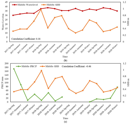 The relationship between the middle reaches of the Yangtze River and runoff, water level, PRCP; (a) the relationship between the SDD and runoff; (b) the relationship between the SDD and water level; (c) the relationship between the SDD and PRCP.