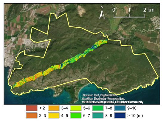 Changes in canopy height were examined with the LiDAR-derived canopy height model (CHM). The NASA G-LiHT mission collected the LiDAR images along a few transects across the Guánica dry forest on 8 March 2017 [32], and the NEON Airborne Observation Platform (AOP) collected the LiDAR images covering the whole site on 28 May 2018. We selected the transect of PR_8March_2017_45_46, which crosses the forest and spans all the elevation range (Figure 2). The section of the transect within the NEON Guánica site was chosen for further analyses. The vertical and horizontal accuracies of both NEON [33,34] and G-LiHT images (glihtdata.gsfc.nasa.gov/, accessed on 8 June 2021) are within 1 m. Aside from the CHM images, we also used the digital surface model (DSM), digital terrain model (DTM), topographical slope and aspect, and rugosity based on the DSM. All images have a spatial resolution of 1 m. We obtained the data from the NEON data portal with the “neonUtilities” R Package and from the G-LiHT site (glihtdata.gsfc.nasa.gov/, accessed on 8 June 2021).
