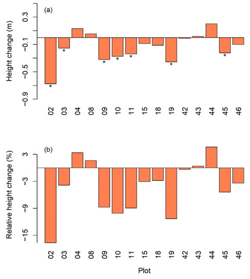 (a) Mean changes in stem height in the 15 plots. The “*” under the bar indicates significant decrease at α = 0.05; (b) relative mean height change.