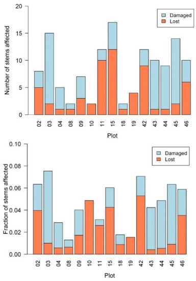The number of affected stems (Figure 4), including the categories of “Lost” and “Damaged”, showed a wide range of variation with the mean ± standard deviation as 4 ± 3.7 for the number of lost stems and as 4.6 ± 4.1 for the number of damaged stems. The mean of the lost plus damaged stems was 8.6 (±4.9). The proportion of lost or damaged stems, that is, the number of lost or damaged stems divided by the total number of stems of the plot (Figure 4 lower panel), showed that the mean ± standard deviation of the fraction of the lost stem and that of the damaged stem were 2.2% ± 1.7% and 2.3% ± 1.9%, respectively. On average, 4.5% of plant stems were affected by the hurricanes.