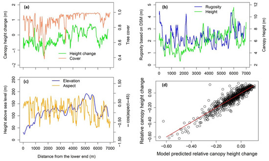 The canopy height change calculated by subtracting the LiDAR-derived canopy height model on 8 March 2017 from the LiDAR-derived canopy height model on 28 May 2018 along the transect within the Guánica forest (a): tree cover (a), rugosity based on digital surface model (DSM) (b), canopy height (b), elevation (c), and cosine function of aspect (c) were derived from the G-LiHT LiDAR data, indicating the status before the hurricanes. The predicted versus monitored relative canopy height change is shown in (d).