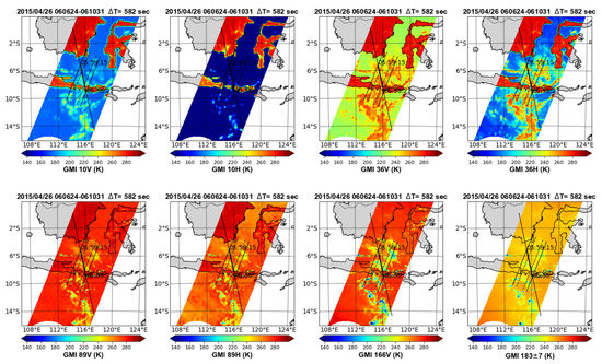 Figure 2 shows an actual CloudSat-GPM coincidence on 26 April 2015, near the Java Sea. Eight GMI TB channels are shown, each superimposed with indications of satellite tracks and radar coverage. A “coincidence segment” is defined as the portion of the CloudSat track that covers the GMI S1 swath. In this example, the ascending GPM orbit crosses the ascending CloudSat orbit, and the coincidence segment extends ~1500-km. Depending upon the relative orbit positions, this distance can be shorter (e.g., at the highest latitudes covered by GPM, where the relative orbits are nearly perpendicular to each other) or longer (when the orbits are both ascending or both descending, near the equator). The length and time duration of the coincidence segment between the CPR and GPM is longer near the equator, where GPM is flying “more parallel” to the CloudSat orbital direction than it does at the higher latitudes.