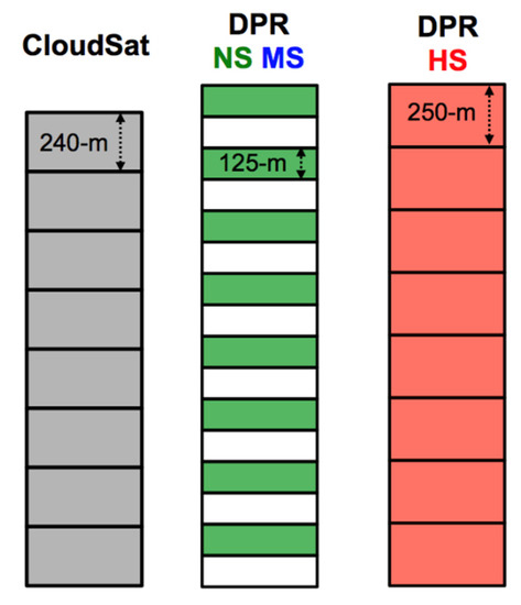 The 2A.GPM.DPR dataset carries three radar profiles: the 176-level Ku-band normal scan (NS), the Ka-band matched scan (MS), and the 88-level Ka-band high-sensitivity scan (HS). After 21 May 2018, the DPR transmit timing was reprogrammed and the HS Ka-band beams were steered to expand the Ka-band MS swath, providing near-coincident Ku/Ka-band coverage across the full 245-km swath [13,14]. While the dataset described in this manuscript does not currently extend in time past September 2016, future versions will incorporate this change.