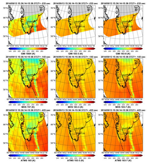 An example of the collocated GMI, MHS and ATMS measurements of a precipitation event over Greenland on 13 September 2014 is shown in Figure 5. Even though MHS and ATMS are across-track scanning sounders with coarser resolutions than GMI, the correspondence between each is obvious. The dashed line that is more or less “parallel” to CloudSat is the NOAA19 or NPP subtrack.