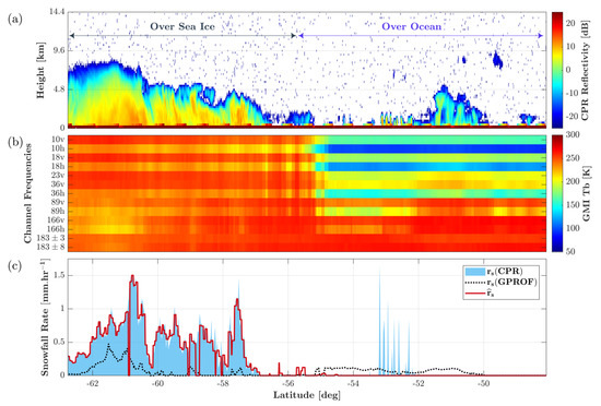 Even though the DPR has higher space-time coverage than the CPR, evidence suggests that it is not sufficiently sensitive to capture the light snowfall events [25,26]. The high sensitivity of the CPR to low concentrations of snow and ice particles makes it perhaps the most accurate spaceborne instrument for the retrieval of high-latitude precipitation, especially the shallow cumuliform snowfall [27,28], which is the dominant precipitation regime over the polar regions. Therefore, coincidences of CPR (2006-present) and GMI provide a unique opportunity to study microwave signatures of light oceanic snowfall in high latitudes over open oceans and sea ice beyond the sensitivity of the DPR data.