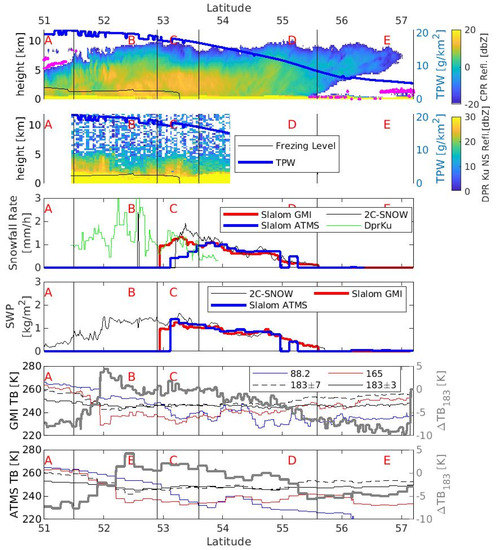 For larger context, Figure 8 shows the maps of the snowfall rate from SLALOM and the surface type characterization from PESCA, comparing the GMI and ATMS retrievals. Several regions are highlighted in the figure with capital letters. Region A is characterized by the presence of relatively high temperature and supercooled droplets (pink dots in Figure 7, panel 1) on top of the cloud outside the area of coincidence between CPR and DPR. Region B is also characterized by relatively warm temperatures (evidenced by the height of the freezing level). In this region, both SLALOM and 2C-SNOW-PROFILE do not detect any precipitation (it is worth noting that these products retrieve only frozen precipitation, and returns no precipitation when liquid or mixed-phase precipitation at the surface is likely), while the DPR-Ku product retrieves solid precipitation. This inconsistency can be attributed to the height of the DPR near-surface bin placed above the freezing level [25]. This feature is noticeable through examination of the second panel. Region C is characterized by an abrupt decrease in the freezing level and by the transition from rainfall to snowfall. All the algorithms in this region show some inconsistencies in the snowfall rate estimate and in detecting the separation between snowfall and rainfall. By contrast, Region D is characterized by colder temperatures and dry snow at the surface. In this region, SLALOM (both for GMI and for ATMS) and 2C-SNOW-PROFILE show a very good agreement in both snowfall rate and snow water path (SWP); some differences can be noted between SLALOM-ATMS and 2C-SNOW in Region D at latitudes higher than 55 degrees, mainly due to the relatively lower spatial resolution of ATMS that causes some underestimation of lower snowfall rates. In Region E, all algorithms agree and do not detect any snowfall. In general, the maps of SLALOM snowfall rate for GMI and ATMS in Figure 8 show a good agreement of the retrieval from the two radiometers, with some differences mainly linked to a slight overestimation of the intensities and a larger snowfall area by SLALOM-ATMS with respect to SLALOM-GMI. The maps of the surface characterization from PESCA are very consistent, especially for the detection of snow-covered areas (the red areas depict the region where PESCA is not applicable due to the high temperature and/or moisture conditions [44]). The main differences are in the thickness of the coastal areas (where PESCA is not used), due to the different IFOV size of ATMS and GMI.