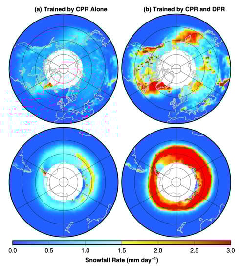 Mean snowfall rate retrieved from 5 years of GMI data using algorithms trained by (a) CloudSat CPR alone and (b) combined CloudSat CPR and GPM DPR.