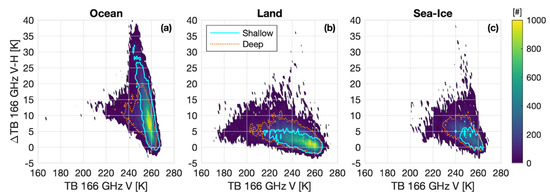 In Figure 10, 2D-histograms of the 166 GHz polarization difference ΔTB (defined as the difference between the 166 GHz vertical (V) TB minus the 166 GHz horizonal (H) TB) vs. the 166V GHz TB are shown for deep stratiform (orange dotted lines) and shallow cumuliform (cyan solid lines) for different surface type. Cloud classification information from the CloudSat 2B-CLDCLASS product that is contained with the 2B-CSATGPM product allows these two snowfall regimes to be easily identified and inflates the scientific value of the ensuing analysis [27]. Over ocean, the distribution of deep stratiform pixels shows a larger concentration of higher 166 GHz combined with higher ΔTB values (Figure 10a, orange dotted line), highlighting the contribution of ice scattering in deep precipitating structures. Oceanic shallow snowfall (Figure 10a, cyan solid line) shows a very polarized signal (exceeding 30 K) and very warm TBs (250–270 K) compared to deep stratiform snow. The extremely dry environmental conditions associated with very shallow precipitation structures allows the high-frequency (166 and 183 GHz) GMI channel atmospheric weightings to peak lower in the atmosphere [54]. Upwelling microwave radiation therefore originates from lower within the atmosphere, with the very polarized oceanic surface contributing to the high observed ΔTB.