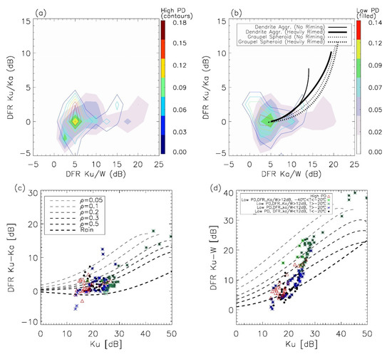 Adapted from Figure 6 and Figure 7 from Gong et al. (2020). (a) The 2D-PDF of CloudSat-DPR collocated Ku/Ka-band DFR vs. Ku/W-band DFR for the “high-PD” (color contours, upper left panel color scale) and the “low-PD” (color shades, upper right panel color scale) scenarios on the triple-frequency diagram together with several theoretical calculated curves for four different ice shapes (black curves). (b) Same as (a) except the 2D-PDF of CloudSat-DPR collocated Ku/Ka-band DFR vs. Ka/W-band DFR is shown. (c) Scattergram of the CloudSat-DPR collocated Ku/Ka-band DFR vs. Ku-band reflectivity values on the theoretically calculated density isolines, each isoline denoted by the legend. (d) Same as (c) except the CloudSat-DPR collocated Ku/W-band DFR vs. Ku-band reflectivity values. In (c,d), the red triangles correspond to “high-PD”, and the other three symbols corresponding to “low-PD”, with different temperature and DFR Ka/W-band values, as identified in the legend for panel (d).