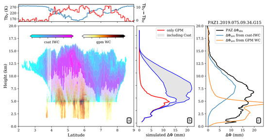 To validate these observations, the CloudSat-GPM coincidence dataset was used to build a look-up-table of vertical profiles of CloudSat-retrieved ice water content (IWC), based on the coincident information from GMI. In this way, IWC 3-dimensional fields can be used to simulate Δϕ based only on collocations between PAZ and GPM, and compare them with actual Δϕ observations [67]. Figure 12 presents one example from a ROHP observation on 16 March 2019, where a good agreement is found above the freezing level when the CloudSat-retrieved IWC is used, whereas the lower layers are better reproduced when using the Ku-band (NS) GPM combined algorithm (CORRA) [8] water content to perform the Δϕ simulations. These findings suggest the capability of polarimetric RO to resolve the height of high-level ice water path, complementing the traditional RO profile estimates of temperature, pressure and water vapor.