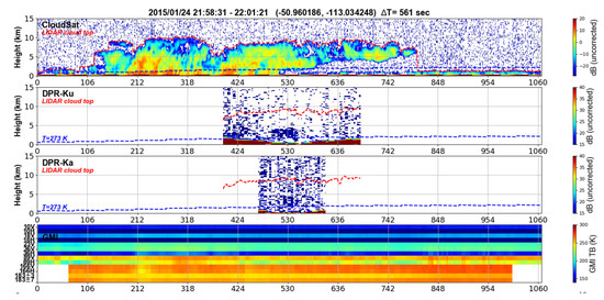 Figure 4 depicts the corresponding radar vertical cross sections, corresponding to the coincidence shown in Figure 2. The horizontal axis extends across the full CloudSat curtain (solid black line in Figure 2), which (in this example) covers 1540 CloudSat beam positions. The top three panels extend to 15-km height above the reference surface, showing the (uncorrected for attenuation) equivalent radar reflectivity profile (dBZ) from CloudSat, DPR Ku- and Ka-band MS (rows 1, 2 and 3, respectively) radar profiles scaled as shown in the right-side color bar. The digital elevation map (DEM) used by the CloudSat and GPM data is shown as a heavy black line near the surface (not obvious here, but it is evident for the over-land cases that are over steep terrain). The fourth row shows the trace of the 13 GMI channels (increasing in frequency from top to bottom). The fifth row shows the surface classification index taken from the GMI Goddard Profiling Algorithm (GPROF) [15] along the CloudSat track. In this example, the surface class flips between ocean and coast as CloudSat moves across the island of Java, and finally to a heavy vegetated land background as the orbit moves across the Java Sea onto Indonesia.