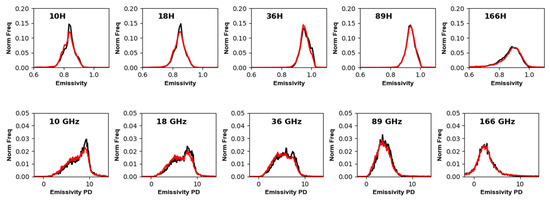 (top row). Normalized histograms of the cloud-free emissivity for the GMI 10H, 18H, 36H, 89H and 166H GHz channels, over snow and ice-covered surfaces. The black curve indicates cloud screening using only CloudSat; the red curve using only DPR. (Bottom row) Same as top row but showing the emissivity polarization difference (PD) defined in the main text.