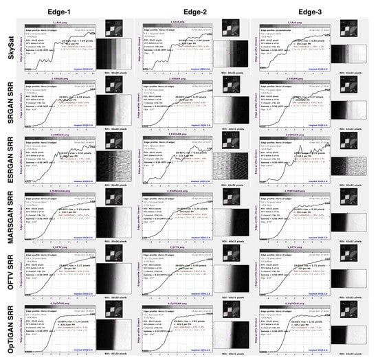 It has been the case that in the field of photo-realistic SRR, many SRR techniques present “fancy” images with four times or even eight times of upscaling factor, but their effective resolution never reaches the upscaling factor. In this paper, we present a more quantitative assessment using the Imatest® slanted-edge measurement for the knife-edge target at the Baotou Geocal site. In Figure 7, we show three automatically detected edges and their associated 20–80% profile rise analysis for each of the input WorldView-3 image, SRGAN SRR result, ESRGAN SRR result, MARSGAN SRR result, OFTV SRR result and OpTiGAN SRR result. The total pixel counts for the 20–80% profile rise of each slanted edge are summarised in Table 3. We divided the total pixel counts of the input WorldView-3 image (upscaled by a factor of 4 for comparison) with the total pixel counts of the SRR results to get the effective resolution enhancement factor for each of the measured edges. Note that the edge sharpness measurements are generally similar but may be different from area to area, even in the same image, thus we averaged three measurements to get the final effective resolution enhancement factor. The average effective resolution enhancement factors are shown in the last row of Table 3.