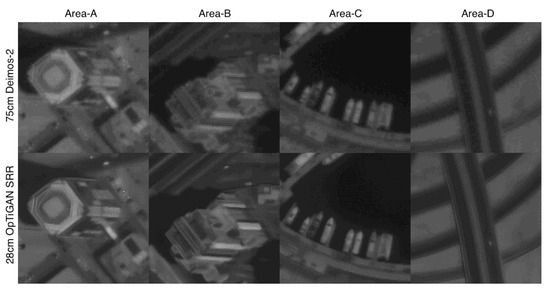 For the Deimos-2 experiments, we used one input for the SRGAN, ESRGAN and MARSGAN SRR processing and three repeat-pass inputs for OFTV and OpTiGAN SRR processing. Four cropped areas (A–D) covering the different artificial targets at the Baotou Geocal site are shown in Figure 8 for comparison with the SRR results and the original input Deimos-2 image.