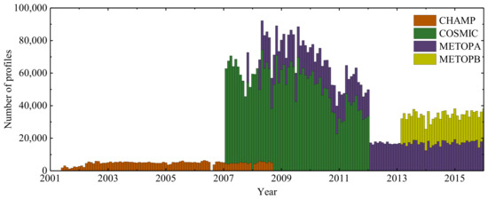 RO atmospheric profiles from the above three missions used in this study covered a 15-year period from 19 May 2001 to 31 December 2015. The monthly numbers for the RO profiles from each of the three missions are presented in Figure 1 (the monthly numbers for the RO profiles from the Metop-A and Metop-B satellites are shown separately). Note that only the profiles with good quality were used (i.e., the badness flag in CDAAC wetPrf file is equal to 0).