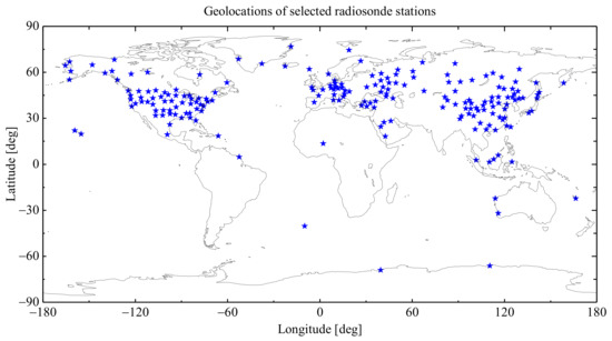 Finally, a total number of 203 radiosonde stations remained, and Figure 2 illustrates their geolocations. Most of the stations are located in the Northern Hemisphere. Thus, the results from this study predominantly represent the climatologies in the Northern Hemisphere, especially in mid-latitude continental regions.