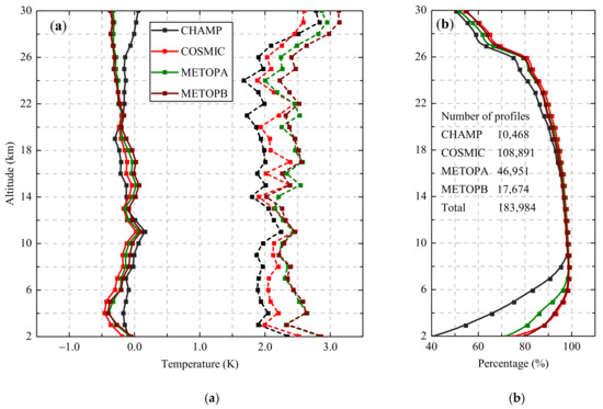 The statistical results of the differences between the temperature profiles from RO and nearby radiosonde stations are presented in Figure 3, including the mean and standard deviation of the differences and the proportion of available collocation profiles at different altitudes (from 2 to 30 km). Note that the RO temperature profiles that deviate from the radiosonde data by more than five times the standard deviations of the temperature differences were regarded as outliers; thus, they were discarded.