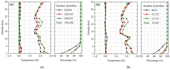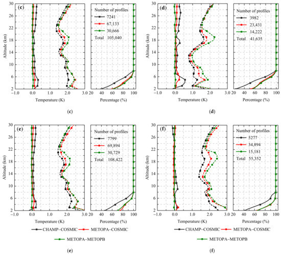 The statistical results of the temperature differences between multi-mission RO profiles in latitudinal bands of 90°S–90°N, 60°N–90°N, 20°N–60°N, 20°S–20°N, 60°S–20°S, and 90°S–60°S [41] are shown in Figure 4. Moreover, temperature profiles with more than five times the standard deviations of the differences were discarded.