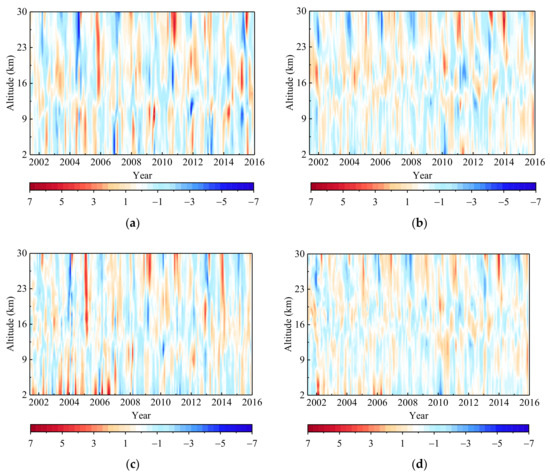 The differences between the RO- and radiosonde-based deseasonalized temperatures show different characteristics at various altitude levels (Figure 5e,f). In the lower troposphere, the differences over the period from 2001 to 2006 are dominated by positive values and have large variability with a maximal value of about 5 K. From 2007 to 2015, the values of the differences are about ±1 K. In the UTLS region, the differences are relatively small, with most values being ±1 K. In the high-altitude region, the differences show a similar temporal structure to that of the lower troposphere, but with smaller magnitudes.