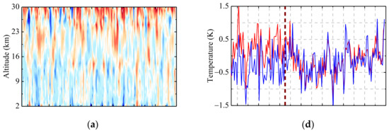 For an initial overview, the deseasonalized RO- and radiosonde-based temperature climatologies at two selected radiosonde stations, Hamamatsu AB in Japan (station ID: JAM00047681, 34.75°N/137.70°E) and Brownsville/INT in the US (station ID: USM00072250, 25.92°N/97.41°W), were determined, and the differences between the climatologies (i.e., ROradiosonde) at the two stations are presented in Figure 5.