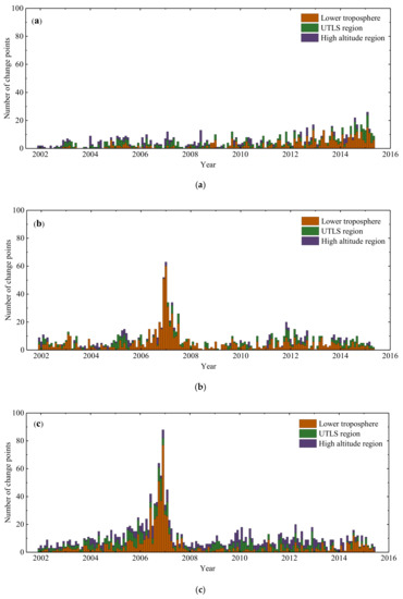 As shown in Figure 7a, in the high-altitude region, the monthly numbers of changepoints for the reference field were generally less than 10 per month. In the lower troposphere and the UTLS region, the monthly number remained consistent from 2001 to 2011, with most values being less than 10. From about March 2012, the monthly number started to increase and reached its maximum (about 20 and 10 changepoints per month for the lower troposphere and the UTLS region, respectively) in February 2015.