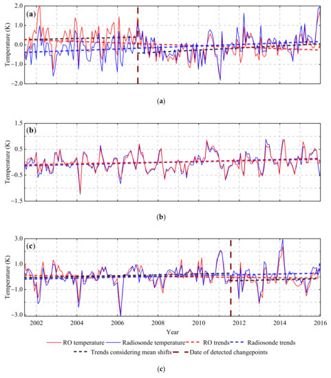 For the layer-average deseasonalized temperature series (Figure 6d–f), the overall structures of the RO- and radiosonde-based series were found to be well-matched, indicating that RO temperature observations can capture the main features of atmospheric variability. However, some temporal mean shifts were still observed. For example, in the lower troposphere, the differences between the RO- and radiosonde-based series range from about 0.5–1 K to about 0–0.5 K at around April 2006 (Figure 6e); in the high altitude region, from 2001 to 2012, the RO-based temperature series are basically consistent with the radiosonde-based series, while obvious negative mean shifts of about 1 to 0.5 K can be observed around March 2012 (Figure 6f).