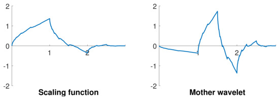 where wavelets that dilate and translate from the mother wavelet constitute the orthonormal basis, Y is the GPR signal function, represents the inner product. An orthonormal basis is a complete orthonormal system for the Hilbert space, representing signals with no redundant information. Although different scaling functions and wavelet groups can have similar bandwidths, they will influence the local mode reconstruction, e.g., sharp curves or smooth oscillation. In this research, the fourth-order Daubechies wavelets are utilized to decompose GPR signals, and the scaling function and the mother wavelet are illustrated in Figure 1.
