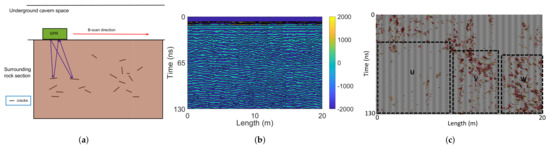Field measurements were carried out in an underground cavern in Huangdao, China, before grouting reinforcement, with the measurement scheme shown in Figure 3a. The underground caverns were built inside the layer of granite for structural stability. We use the GPR instrument from ‘MALA-Geoscience’, moving along the cavern surface and transmitting 250 MHz electromagnetic waves into surrounding rock sections. The wave frequency is 250 MHz to reach the depth around 7 m. The measurement length of an example section is m, and the time window is 130 ns. Figure 3b presents the original radargram. Since opening the rocks and obtaining the actual rock distribution are difficult, a finely processed radargram by expertise is used as ‘ground truth’ (Figure 3c).