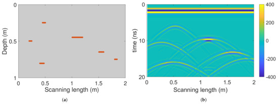 Since visibly obtaining the actual fissure distribution inside the surrounding rocks is difficult, the numerically generated radargram is analyzed to compare the reconstructed profile with the preset geometric model. The open-source software, ‘gprMax’ [51], can simulate electromagnetic wave propagation inside the subterranean sections and have been extensively applied in evaluating GPR signal processing approaches (e.g., [52,53]). We assume that the signal reflections are all generated by rock fissures, not strata interfaces, since the underground caverns are built inside the single layer of granite. In this paper, we simulated the GPR signals from a subterranean area with the measurement length 2 m and depth 1 m. The subterranean material is granite with relative permittivity of 7 [54] and conductivity of 0.012 [55]. The model includes six horizontal 5 mm-thick cracks (the direction is limited by ‘gprMax’, vertically or horizontally) filled by air, as shown in Figure 4a. The simulated grid step is m, and the time window is 20 ns. GPR transmits an 800 MHz ricker wave and receives A-scan traces with 0.01 m intervals. The simulated radargram after pre-processing is presented in Figure 4b. The hyperbola tails in the radargram affect the visibility of crack sizes and locations.
