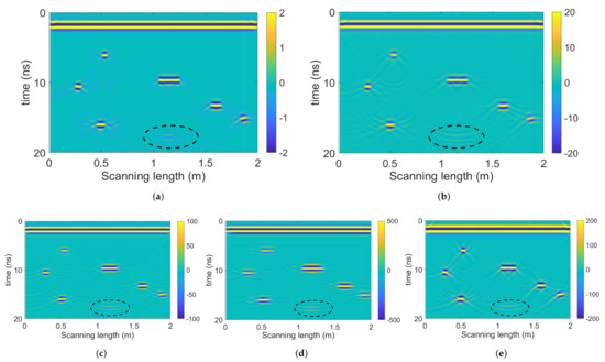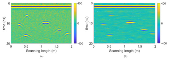 Noise is a significant issue affecting GPR signals. We add Gaussian white noise to the radargram to simulate the random noise. The same model in Figure 4a is utilized, and the polluted radargram (the signal-to-noise ratio is db) is shown in Figure 7. Noisy speckles occupy the radargram, affecting the visibility of target signals and hyperbola tails.