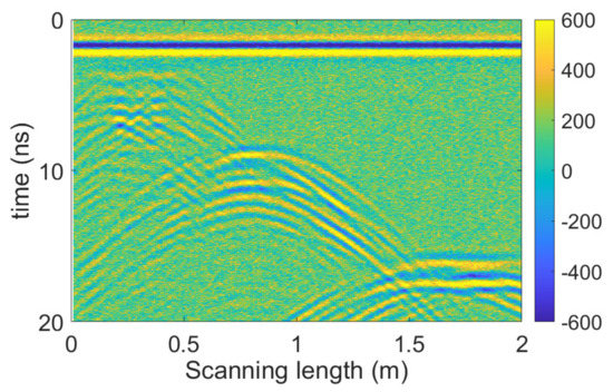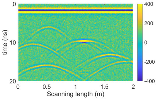Similarly, we consider the noise effect by adding Gaussian white noise to the radargram (Figure 10b), with the polluted profile (signal-to-noise ratio −5 db) shown in Figure 13. Noisy speckles occupy the radargram, affecting the visibility of target signals and hyperbola tails.