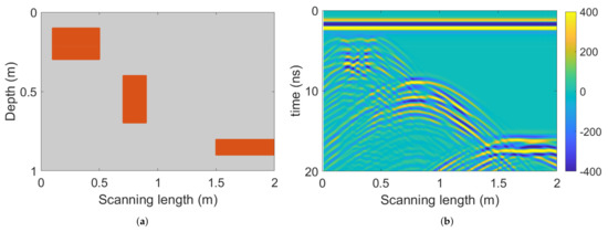 (a) Simulated subterranean area with three fractured rock portions ( m and m; m and m; m and m). (b) The pre-processed radargram.