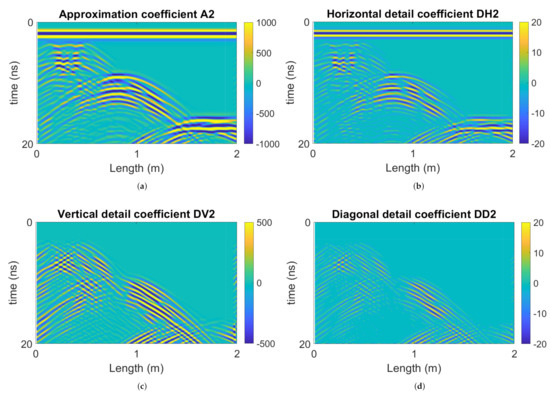 2nd-layer coefficients from 2D SWT on Figure 16. (a) approximation coefficient , (b) horizontal detail coefficient , (c) vertical detail coefficient , and (d) diagonal detail coefficient . Signals weaker than 2.5% of the maximum amplitude are excluded.