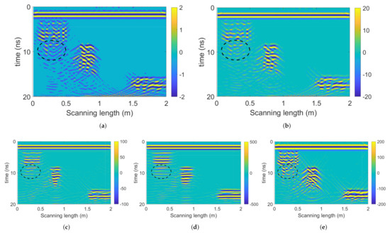 F-K migration results of (a) 1st-layer , (b) 2nd-layer , (c) 3rd-layer , (d) 4th-layer , and (e) pre-processed radargram without SWT decomposition.