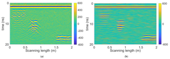 Firstly, the pre-processed radargram is decomposed by 2D SWT, with the 2nd-layer coefficients shown in Figure 17. Similar to the simulation results, hyperbola tails have been decomposed to and . The approximation coefficient presents similar distribution to the pre-processed radargram. Only discards part of the noise and hyperbola tails, and preserves the target signals. Therefore, the horizontal coefficients are considered for further migration.