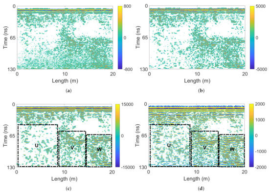 The F-K approach migrates , , , and the pre-processed radargram for comparison, as illustrated in Figure 18. The signals inside region U and the lower part of region V are weak in Figure 3c, but direct F-K migration preserves intensive signals (Figure 18d). This is affected by clutter. The 2D SWT can mitigate the clutter and thus the signals inside region U and the lower part of region V in Figure 18c become less intensive. Region W is identified as severely fractured rock areas. 2D SWT has demonstrated good practice in enhancing the migration results.