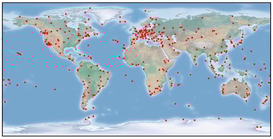 After these studies, the importance of water vapor and the need of improving its spatial and temporal resolution and coverage was acknowledged in some studies, such as []. Moreover, GNSS meteorology was found to be suitable for this task, as most of the infrastructure was already there (for navigation and geodetic applications, mainly). Therefore, it was a unique opportunity to obtain more meteorological information at a very low cost. However, these efforts would be useless without the information provided by services like the International GNSS Service IGS [], operating since 1994 and providing necessary information for the processing of GNSS data, such as precise and real-time orbits, clock corrections, tropospheric products, and so on. The IGS counts with a global network of ground-based receivers and a set of Analysis Centers to process their data. This global network is depicted in Figure 1.