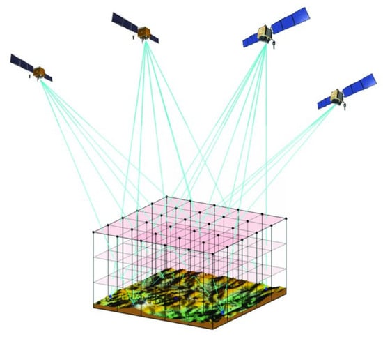 Schematics of the function-based tomography []. The satellite and receiver images are originaly made by Freepik (https://www.freepik.com) and Flaticon (https://www.flaticon.com/) (accessed on 10 June 2021).