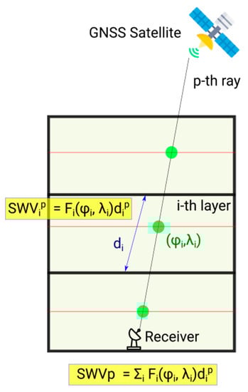 Voxel-based methodologies, despite being quite popular, have some drawbacks: (1) the rank deficiency in the coefficient matrix, leading to the need of applying constraints; (2) the assumption that water vapor is constant in the space inside each voxel; and (3) the number of unknown parameters is high compared to the number of observations. In order to avoid these drawbacks, some methodologies avoiding the use of voxels have been developed. One of then considered a function-based tomography, as Figure 3 shows. This approach uses B-spline functions and a distribution of the atmosphere in layers as the base to build the system of equations. A prior constraint of the 3D structure of the water vapor needs to be applied in this vector, based on radiosonde data. A test [] with a 17-station network in California was carried out, comparing the conventional, voxel-based method, and this new B-spline function method, both validated against radiosonde observations. RMSE was reported to reduce by about . Instead of B-spline functions, Zhang et al. [] proposed another method based on nodes rather than in voxels, with the aim of reducing the discretization effects. Also, a piece-wise linear fitting was used, instead of the standard (one-time) one. In an experiment to compare the standard method and this node-based method against reference radiosonde profiles, RMSE was found to decrease from to . The improvement was stronger in rainy days.