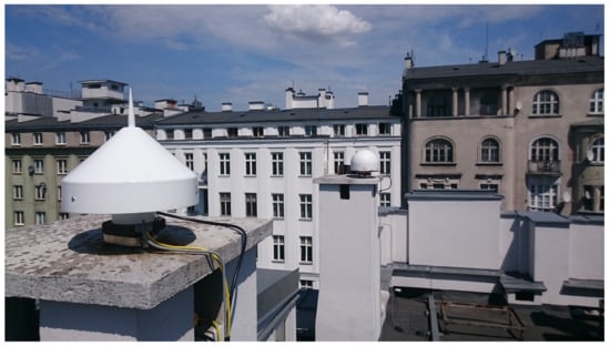 The experiment was conducted using observations captured by two stations, located on the roof of the Main Building of the Warsaw University of Technology: WUT1 and WUT2, 4.75 m apart. Both stations are located in a typical environment for reference stations. Measurements were recorded using Septentrio PolaRx5 receivers connected to a Leica Choke-Ring AT504 antenna at WUT1 and a Septentrio PolaNt ChokeRing B3/E6 at WUT2 (see Figure 1). GPS and Galileo raw data collected on 29 June 2018 (180 DOY) at 1 Hz rate were used. There have not been many changes in the GPS and Galileo constellations since then, so the results obtained can be considered up-to-date.