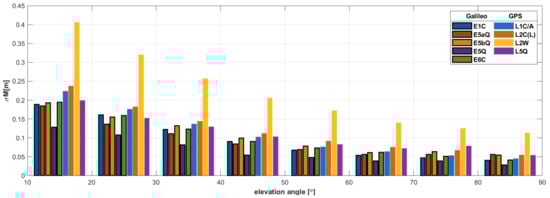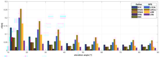 The determined values of the STD of the multipath impact on code observations (see Equation (19)), depending on the satellite elevation are presented in Figure 2. The statistics were calculated for 10-degree elevation bins, starting from an elevation mask of 10°. The obtained results concern observations recorded by the WUT2 station. The STD of the multipath effect are very close to each other, with two apparent exceptions. The smallest values, for all elevation bins, were obtained for the E5 AltBOC observation. The highest error values, in turn, were obtained for the L2W observation, which may be influenced by the specificity of tracking this observation, related to SNR degradation and its impact on the observation tracking accuracy. For other types of observations, for the lowest elevation bin, the multipath impact on Galileo turns out to be only marginally smaller than that for GPS. It is likely that, if the observations were recorded in an environment more susceptible to the multipath effect, much larger differences for the different signal types would be visible. The graph shows the general correlation between the magnitude of the multipath and the satellite elevation.