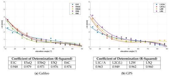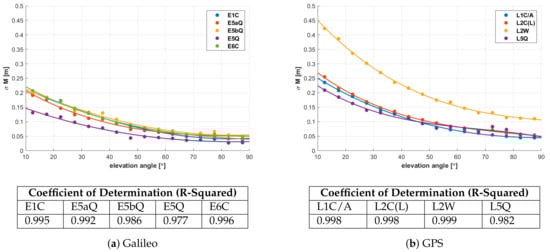 The values of STD of the multipath effect determined for smaller, five-degree elevation bins were selected as the test data for the model. Preliminary analyses pointed to the third-degree polynomial as the function best describing the relation between multipath and satellite elevation. The third-degree is a trade-off between accuracy and quality of fitting the polynomial curve to the data. Higher degree polynomials fit the data perfectly but do not represent them in an expected manner. The determined functions are presented in Figure 4 along with the values of the R-Squared determination coefficient, which indicates the quality of the model fit to the data. Values of the coefficient ranging from 0.97 to 0.99 indicate a very good fit of the model to the given values of STD. Based on the equations describing the multipath with respect to elevation, the model values for three selected satellite elevations were calculated (see Table 2).