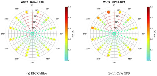 Over the past several years, multipath error analysis has been performed for Multi-GNSS solutions (GPS, GLONASS, Galileo, and BeiDou) [21] as well as single-system solutions: BeiDou (e.g., [22,23]) and Galileo (e.g., [2,24,25,26]). The analysis demonstrates the superiority of the Galileo code observations, especially the E5 AltBOC signal, over GPS observations as well as BeiDou and GLONASS systems (RMS of code multipath and noises for E5 Galileo equal to 0.1 cm, whereas for signals of other GNSS systems, the value of this error ranges from 0.2 to 0.4 m). The largest multipath errors were recorded for GLONASS observations.