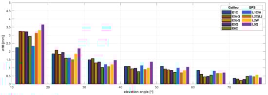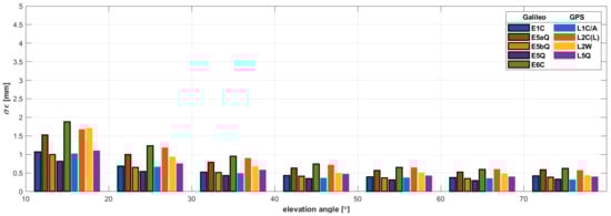 Figure 3 shows the STD of measurement noise, determined on the basis of Equation (18). In this case, much larger discrepancies between given observations are visible. Again, the observation type that stands out is the E5 AltBOC signal, for which the obtained noise values are much smaller. Galileo observations have better measurement noise properties than GPS observations. Only in the case of the modernized L5 observation are the obtained results comparable to that of the Galileo system.
