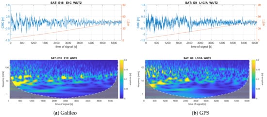 CMC observables and scalograms for (a) Galileo E18 and (b) GPS G09 satellites at the WUT2 site.