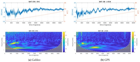 Double-difference phase residuals and scalograms for (a) Galileo E18 and (b) GPS G09 satellites.