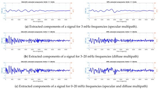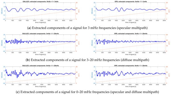 From the CMC scalograms, it can be seen that the observation series of both satellites show disturbances with similar characteristics at similar times, with frequencies of approximately 10 mHz, mainly in the initial part of the analyzed signals (i.e., for low satellite elevations). What is distinctive is also the disturbance that occurs between the 2400th and the 3000th seconds. It is worth noting, however, the presence of low-frequency components in the signal, at approximately 1 mHz, observed for up to about the 3000th second. In the figures showing the extracted components of the signal, it is clearly visible that it is the components with higher frequencies that are characterized by larger amplitudes. The characteristics of individual disturbances for both satellites are very similar. Table 4 shows the maximum values of amplitudes for given components of the signal. It should be emphasized that these statistics concern only those fragments of observations when the satellite was observed at an elevation of at least 10° (the figures show the range of observations from an elevation of 5°). Thus, these amplitudes represent the maximum values of the observation errors due to the multipath effect for given signal reflections. It can be seen that the highest values of the multipath errors have been recorded for the whole frequency range characteristic for this phenomenon. The peak-to-peak amplitudes of the multipath error are equal to 1.094 m for Galileo E1 observations and 1.434 m for GPS C/A code. The impact of specular reflections in the examined case turns out to be more than two times smaller. The errors determined in this way are larger for the GPS signal in almost every case, which confirms the conclusions regarding the superiority of the Galileo code observations with respect to GPS.