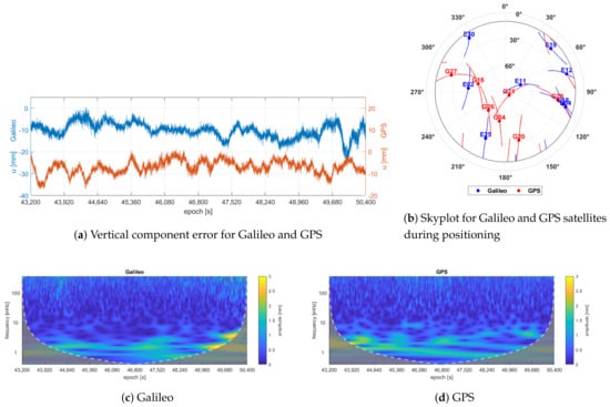 Vertical components (a), skyplot (b) and scalograms for Galileo (c) and GPS (d).