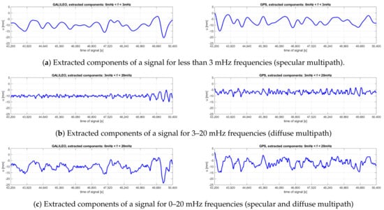 Figure 15 shows the decompositions of the signal of the u-coordinate series into components of frequencies typical for the multipath effect. These diagrams confirm that the main disturbances in the determined values are linked with low frequencies of changes. The individual maximum errors of coordinates and the range of amplitudes of these errors are summarized in Table 7. For the low-frequency range, related to specular reflections of the signal, the characteristics of disturbances for both systems are very similar. It can be noticed, however, that the amplitude of fluctuations for Galileo observations is minimally larger than that for GPS. For the higher frequency range, from 3 mHz to 20 mHz, except for the final part of the series, the amplitude of the fluctuations related to the diffuse reflections of the signal is smaller for the Galileo system.